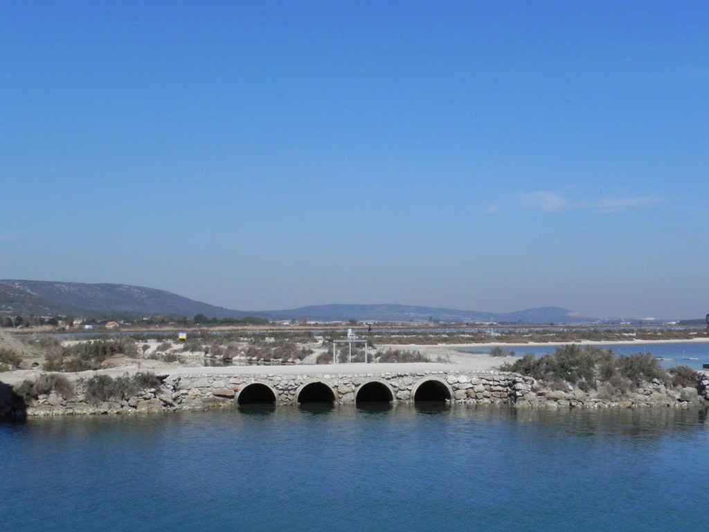 Der Kanal ist hier mit Steinwällen in Salzseen eingebettet.