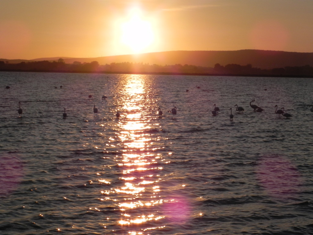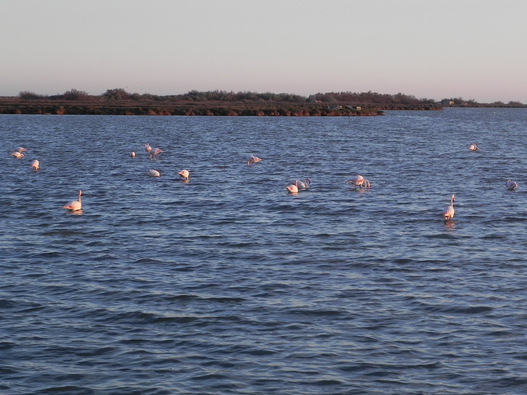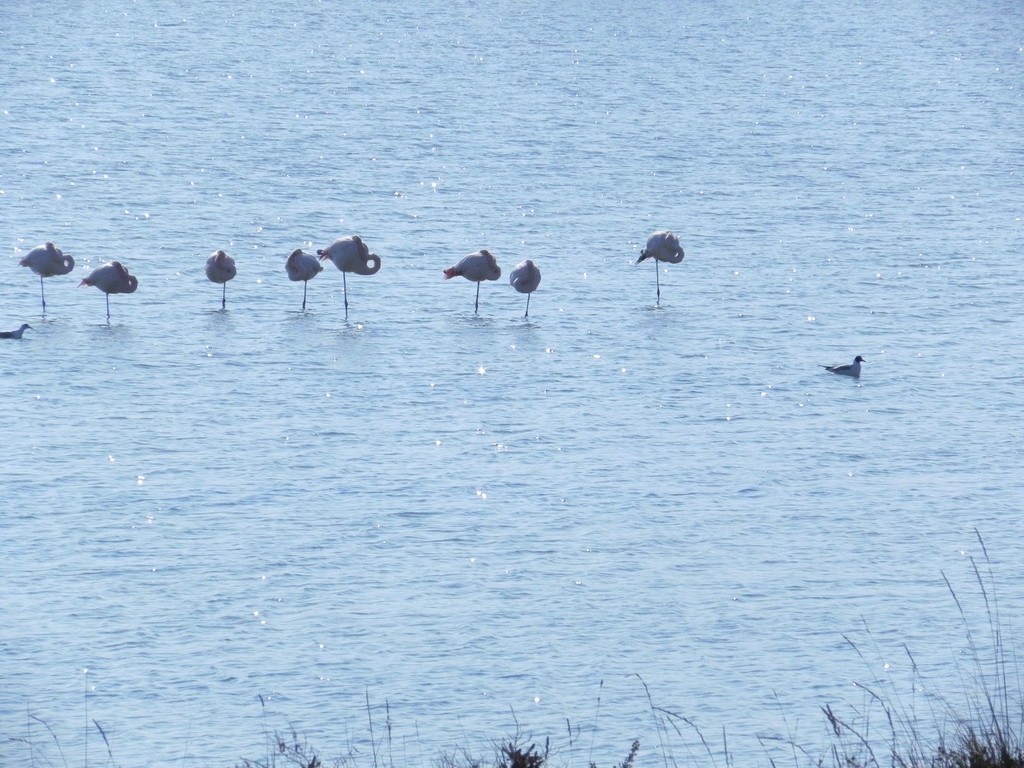 Es gibt eine Menge Flamingos. In der Nachmittagsonne sehen die besonders rosa und imposant aus. Eine schöne Gegend.
