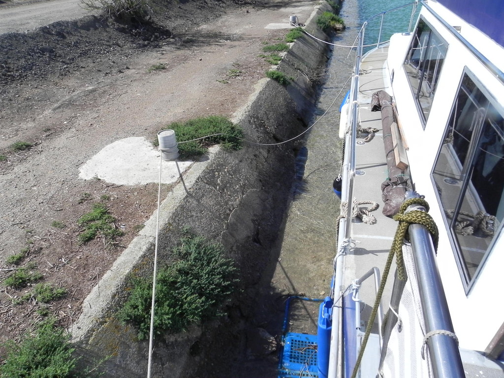 Ich habe zu lange gebraucht. Der Wind hat mein Schiff quer in den Kanal gestellt. Aber, ich habe wie so oft auf dieser Fahrt, Glück. Der Wind treibt das Schiff weiter und nach einiger Zeit liegt es, entgegengesetzt der eigentlichen Fahrtrichtung, am Kanalrand. Jetzt ist es ein Leichtes, auch die Heckleine zu befestigen. Ich habe den perfekten Übernachtungsplatz an der Maguelone in der Nähe von Palavas gefunden und meine ersten kleinen Abenteuer überstanden. Die Reise hat begonnen!