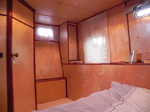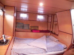 Man betritt die Eignerkabine über eine kleine Treppe aus dem Salon. Der Raum ist durch eine Tür vom Salon getrennt und bietet so einen privaten Rückzugs-Bereich.